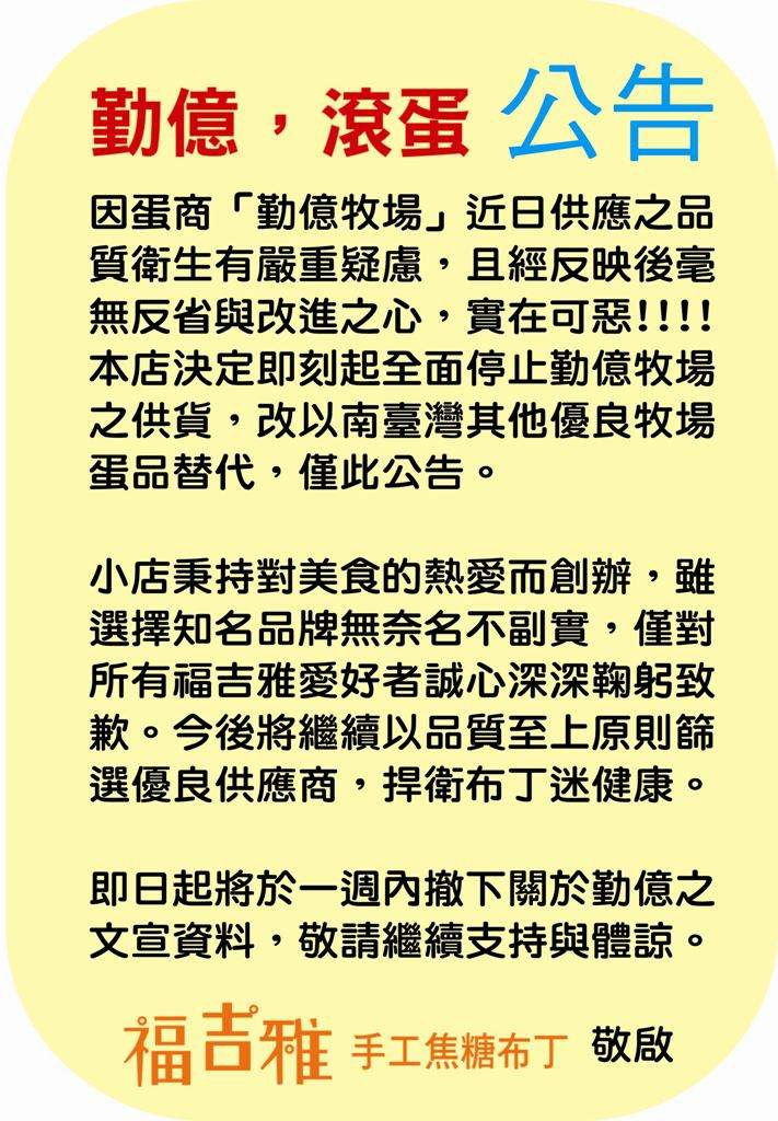 即刻起,因勤億蛋品品質惡劣、毫無反省改進之心,令人不齒!!!!本店將全面停止勤億蛋品之供貨,並另尋其他優質蛋場合作,公告如圖,歡迎10/10前至粉絲團按讚轉分享,