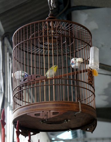 我們養綠繡眼小哈利之後,每天響亮高亢的歌聲也吸引了大黃貓,他很淡定地在對面平房屋頂上遙望著哈利的動靜,然後每天移動近一點,某天上午,大黃貓斗膽爬進了福吉雅的鐵欄杆內,距離小哈利的鳥籠大約布到一公尺的距離,在下方酣睡的布丁妹渾然不知屋頂上的掠食遊戲....,此時,剛好布丁爹推開紗門要餵狗喝水.....往上一看,驚見黃貓,大喊了聲:”你要幹嗎?”大黃貓嚇一大跳.......從此不敢再覬覦小哈利。