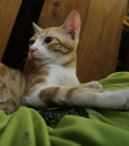 那時我和布丁哥晉太郎早已四處尋找有緣份的小貓,看過幾隻都不甚投緣,緣分這東西很奇妙,像我家搗灰就是在一次無心的閒談中,不小心遇見想出養的原主人,在一周內迅速移民來我家,帶給我們很多快樂。一聽到有小橘貓要出養,趕緊與晉太郎冒雨騎機車趕去看,一眼就喜歡,帶了回來。