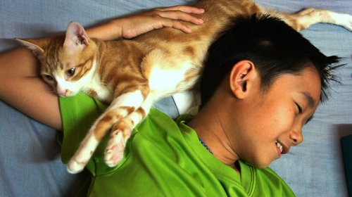 隔一個晚上,妮仍愛動不動,我給她一點水和食物,帶她去貓砂盆尿尿,讓她出來和搗灰一起聚聚,灰心疼地舔舔她,等休息得差不多,又把奄奄一息的她放回去。下午,晉太郎下課一回家,立刻飛奔到紙箱旁喚她的名.....妮子竟然貓嗚一聲,這可是幾天來難得的回應,我心中默想,迴光返照了。晉把妮輕輕抱出來,像往常一樣,鼻子對鼻子親親,神奇的事情發生了,原本已經活動力極少的妮,磨蹭著哥....奮力擩動著身軀。