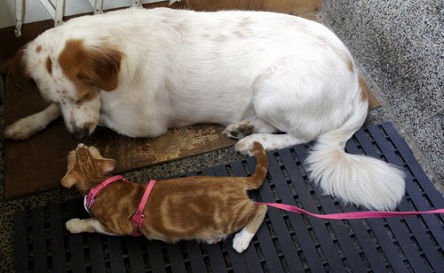妮子完全不怕狗...甚至非常喜歡狗??也許是因為小時候和李姊姊的狗兒同居的關係吧! 聽說那時候時常跟狗撒嬌哩!! 那天帶她去布丁妹房間,反而是布丁妹很不知所措....