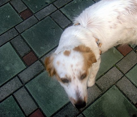 (2) 跟著便當走:她可能是流浪慣了,聞到便當味就跟著走...一副諂媚樣,想要偷啃兩口。慶中街附近常有好心人放便當在地上,她會不顧一切過馬路衝過去吃兩口....至少聞兩下。大家不必可憐她,因為我也有時候會煮豬肉販.雞丁飯給她吃一下.為她的健康,除了大骨頭或狗零食,不給她吃其他有害健康的食物。