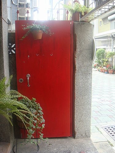 門口擺著崇德路一家花店老闆娘親自移植的常春藤,她說,這種深色的常春藤非常堅強耐旱又耐冷...生命力強韌,又有自然優美的姿態,擺在紅色鐵門上最適當不過哦!